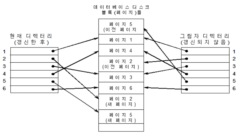| ∘그림자 페이지 기법은 단일 사용자 환경에서는 로그를 사용할 필요학 없고, 다수 사용자 환경에서는 동시성 제어 기법에 로그가 필요함 ∘회복을 위하여 데이터베이스는 여러개(N)의 고정된 크기의 디스크 페이지들로 구성되며, 디렉터리의 i (1<i<N)번째 엔트리는 i번째 데이터베이스 페이지를 가리키고, 데이터베이스에 대한 모든 읽기, 쓰기 연산은 디렉터리를 통하여 이루어짐 ∘트랜잭션 수행 방법 - 트랜잭션이 시작할 때: 현재 디렉터리를 그림자 디렉터리로 복사함 - write_item연산을 수행할 때: 수정된 데이터베이스 페이지의 새 사본을 생성하고, 현재 디렉터리 엔트리가 새 사본을 가리키도록 수정함 - 트랜잭션을 완료할 때: 그림자 디렉터리를 폐기하고 그 그림자 디렉터리가 참조하는 이전 페이지들을 반환함 ∘트랜잭션 복귀 방법 - 수정된 데이터베이스 페이지를 반환하고, 현재의 디렉터리를 폐기함 - 그림자 디렉터리를 현재 디렉터리로 설정함 ∘특징 - 단일 사용자 환경에서 로그가 불필요하며, 다사용자 환경에서는 동시성 제어 기법에 로그가 필요한 경우 회복 기법에서도 로그가 필요할 수 있음 - NO-UNDO/NO-REDO 기법으로 분류할 수 있음 ∘장점 - 트랜잭션 실행 결과의 UNDO가 간단함 ∘단점 - 갱신된 데이터베이스 페이지들의 디스크 상의 위치가 변하기 때문에 클러스터링이 어렵고, 디렉터리가 큰 경우 오버헤드가 심각하다. 그리고 트랜잭션 완료시 쓰레기를 수거해야 하는 문제가 있음 ![]() [그림 4] 그림자 페이지의 예 |