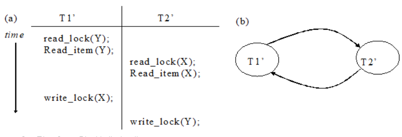 | ∘2단계 로킹(Two-Phase Locking, 2PL) 프로토콜 = 기본적(basic) 2PL - 확장단계(growing phase, expanding phase): 항목들에 대한 새로운 로크를 획득할 수 있지만 해제할 수 없음 - 수축단계(shrinking phase): 이미 보유하고 있는 로크들을 해제할 수 있지만 어떤 새로운 로크를 획득할 수 없음 - 만일 로크 전환이 허용된다면, 로크 상승(읽기 로크 상태에서 쓰기 로크로)은 확장단계 동안 수행되어야 하고, 로크 하강(쓰기 로크 상태에서 읽기 로크로)은 수축단계에서 수행되어야 함. - 스케줄에 있는 모든 트랜잭션들이 2단계 로킹 프로토콜을 준수하면, 그 스케줄은 직렬가능함이 보장되고 더 이상 스케줄의 직렬성을 검사할 필요가 없어짐 ∘2단계 로킹의 변형: 기본적(basic) 2PL의 변형 - 보수적(conservative) 2PL 또는 정적 (static) 2PL: 트랜잭션이 수행을 시작하기 전에 그 트랜잭션의 읽기 집합(read set)과 쓰기 집합(write set)을 미리 선언함으로써 그 트랜잭션이 접근하려는 모든 항목들에 로크를 획득하도록 하며, 교착상태가 발생하지 않는 프로토콜임 - 엄격한(strict) 2PL: 트랜잭션 T가 완료되거나 철회될 때까지 T가 보유한 배타적(쓰기) 로크들 중 어떠한 로크도 해제하지 않는 것으로 가장 널리 사용되는 프로토콜임 - 엄중한(rigorous) 2PL: 트랜잭션이 완료되거나 철회될 때까지 그 트랜잭션의 어떠한 로크(배타적 로크이든지 혹은 공유 로크이든지)도 해제하지 않음. ∘교착 상태 - 두 개 이상의 트랜잭션들로 구성된 집합 안에 있는 각 트랜잭션 T가 그 집합 안에 있는 다른 트랜잭션 T′에 의해 로크 된 어떤 항목을 기다릴 때 발생함 ![]() [그림 1] 교착 상태의 예 (a) 교착 상태에 있는 T1'과 T2'의 부분 스케줄 (b) (a)에 있는 부분 스케줄에 대한 대기 그래프 |