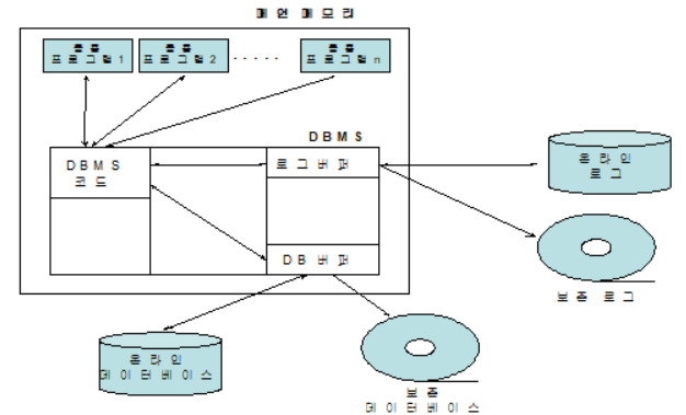 | ∘회복과 관련된 저장장치는 장애 탄력성에 따라 소멸, 비소멸. 안정 저장 장치로 구분됨 - 소멸 저장장치(volatile storage): 메인 메모리와 같이 시스템의 붕괴와 함께 저장된 데이터 상실 - 비소멸성 저장장치(non-volatile storage): 디스크나 테이프와 같이 시스템 붕괴 시에도 보통 저장된 데이터 손실되지 않으며, 저장장치 자체의 고장으로 손실 가능 - 안정 저장장치(stable storage): 데이터의 손실이 발생하지 않게 여러 개의 비소멸 저장장치로 구성된 저장장치 ![]() [그림 3] DBMS의 저장장치 계층 ∘디스크와 메인메모리 사이의 블록 이동 - Input(Bi): 데이터 Bi가 포함되어 있는 디스크 블록을 메인 메모리로 이동 함 요청에 의해(On demand) - Output(Bj): 데이터 Bj가 포함되어 있는 버퍼 블록을 디스크 블록에 이동시켜 기록 함 버퍼 관리자에 의해(by Buffer Manager) ∘프로그램과 데이터베이스 사이의 데이터 이동은 다음과 같으며, 대문자 X는 데이터 아이템 이름이며, 소문자 x는 프로그램 변수(local variable)를 지칭함 - Read(X) : 데이터 아이템 X의 값을 지역 변수 x의 값으로 지정하며, 그 절차는 데이터 아이템 X가 버퍼 블록에 없으면 x가 포함된 블록 Bx에 대해 Input(Bx)를 실행하고, 버퍼 블록에 있는 데이터 아이템 X의 값을 변수 x에 지정 - Write(X) : 지역 변수 x의 값을 버퍼 블록에 있는 데이터 아이템 X에 지정하며, 그 절차는, 만일 데이터 아이템 X가 버퍼블록에 없으면 x가 포함된 블록 Bx에 대해 Input(Bx)를 실행하고, 변수 x의 값을 버퍼 블록에 있는 데이터 아이템 X에 지정 ∘Bx의 강제 출력(force-output) - 버퍼 관리자가 메인 메모리 버퍼 블록의 메모리 공간을 필요로 할 때 혹은 변경된 아이템 X를 디스크에 출력할 경우와 같이 어쩔 수 없이 수행하는 Output(Bx)를 말함 ∘어떤 트랜잭션이 처음 X 접근할 때 Read(X) 실행, 이때 내부적으로 Input(Bx)가 실행됨 ∘트랜잭션이 X에 대한 연산을 모두 마친 뒤에 변경된 X의 값을 데이터베이스 자체 반영은 Write(X)를 실행하며, 이 Write(X)를 위한 Output(Bx)은 보통 즉각 실행되지 않음 - 접근이 끝나지 않은 아이템이 존재하거나 혹은 버퍼가 다 차지 않아서 기다리는 경우임 ∘Write(X)는 실행했으나, Output(Bx)가 실행 전에 시스템이 붕괴하면, 변경된 값 상실 됨 |