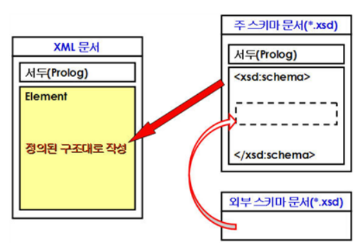 | <?xml version="1.0" encoding="euc-kr"?> <루트엘리먼트 xmlns:xsi="http://www.w3.org/2001/XMLSchema-instance" xsi:noNamespaceSchemaLocation="스키마 문서 URI"> </루트엘리먼트> |
