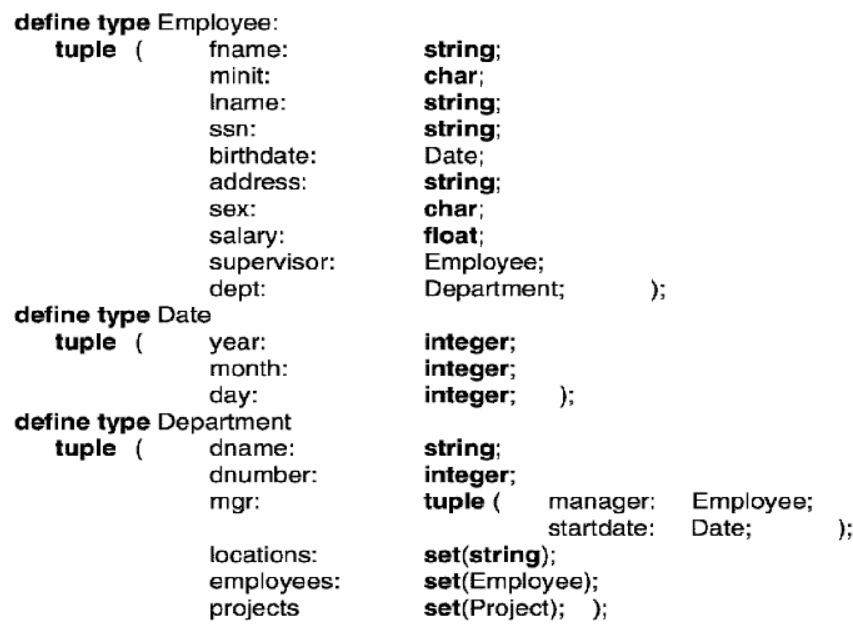 ∘타입 생성자를 구체화한 객체 데이터 정의어(ODL: Object Definition Language)는 특정 데이터베이스 응용을 위한 객체의 타입 정의에 사용할 수 있음![]() [그림 2] 타입 생성자를 사용한 Employee, Date, Department 객체의 타입 정의 |