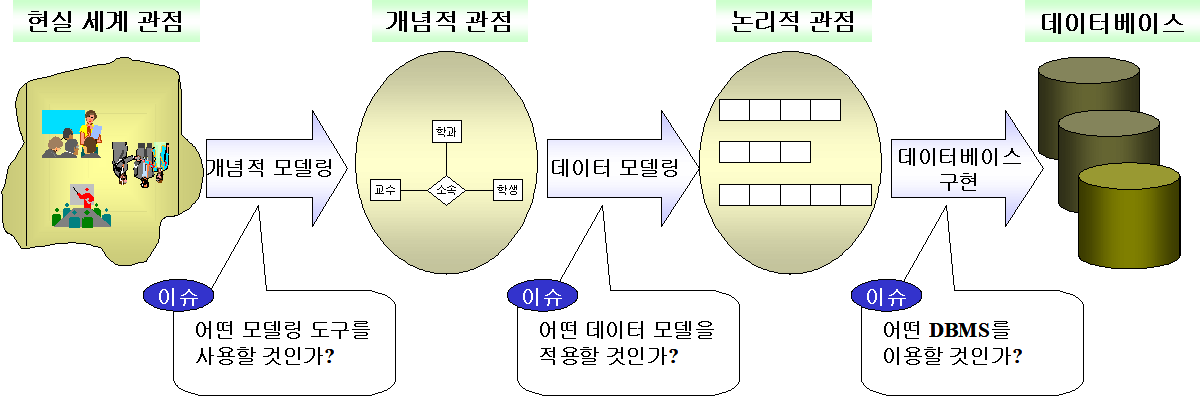 ∘데이터베이스 설계(database design)는 현실 세계의 개체를 개념적인 구조와 논리적인 구조를 거쳐 실제 데이터를 저장할 수 있는 물리적 구조로 변환하는 것을 칭함