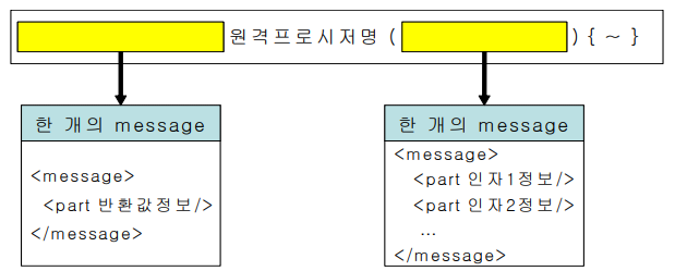 | <message name="메시지 이름"> <part name="인자 또는 반환 변수 이름" type="데이터 타입"/>