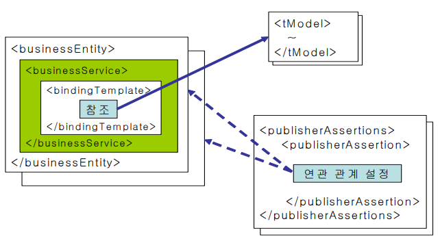 <bindingTemplate> 요소는 웹 서비스에 대한 메소드의 종류 및 인자의 데이터 타입이 정의된 WSDL 문서의 URL 경로가 기술된 <tModel> 요소를 참조한다.