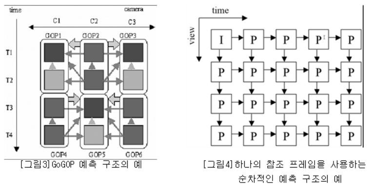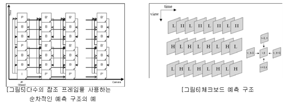 그림4에서는 순차적인 시점 예측구조를 나타내고 있는데, 첫 번째 시점(카메라)은 규칙을 따라서 시간적 예측을 통해 코딩되고, 다른 시점은 시간적인 예측과 함께 같은 시간 축에 있는 바로 이전 시점의 영상에서도 예측하여 코딩한다. 그림5에서는 다수의 참조 프레임을 사용하는 순차적인 예측 구조를 나타내는데, 다음의 5가지의 프레임 타입이 있다.