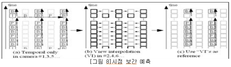 그림8에서 처럼 우선 1,3,5,...번째 카메라의 비디오를 MPGE-4 AVC로 (a)처럼 코딩 한 다음, 그 사이의 카메라인 2,4,6,...번째 카메라의 비디오를 1,3,5,...번째 카메라의 코딩된 비디오에서부터 (b)와 같이 보간을 한다. 그리고 그 보간된 프레임을 참조 프레임으로 추가하여 (c)에서 처럼 코딩하여 코딩효율향상을 기대하는 것이다.