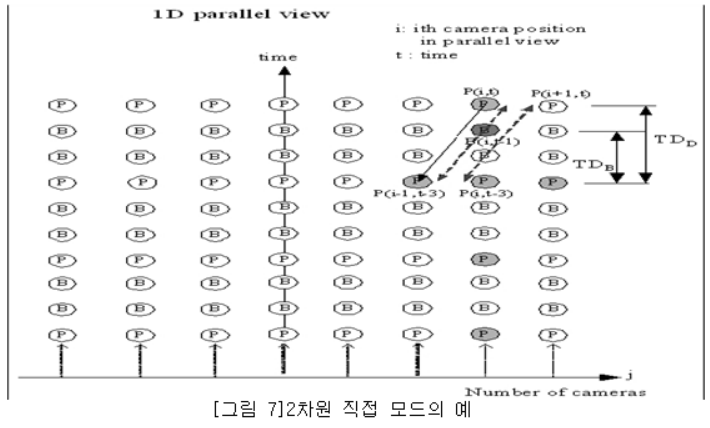 그림7과 같이, 이 방법은 B프레임 코딩 시에 기존의 시간적 직접 모드를 다른 시점을 참조하는 P프레임에서는 예측이 안 되는 것을 보완, 수정하여 다른 시점간의 직접모드를 가능하게 하였다.