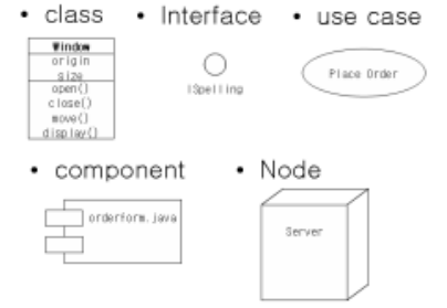 패키지(package) : 요소들을 묶어준다. 구조사물, 행동사물을 포함한 다른 그룹사물까지도 포함할 수 있다. 컴포넌트가 물리적인 것임에 비해 패키지는 개념적이다.
