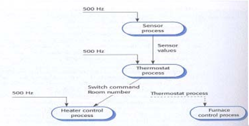 - 즉, 500Hz로 센서 프로세스는 온도조절 프로세스에게 센서값(Sensor value)를 보내고, 마찬가지 로 온도조절 프로세스는 히터 제어 시스템에게 스위치 명령과 방번호(Switch command, Room