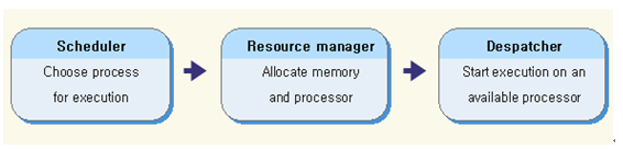 ④ 자원 관리기(A resource manager): 실행을 위한 스케쥴된 프로세스가 주어졌을 경우, 자원 관리 기는 필요한 메모리와 프로세서 자원을 할당한다.