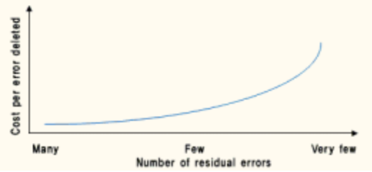 다음 그림에서 볼 수 있듯이 에러의 수가 줄어들수록 에러를 제거하는데 드는 비용은 기하급 수적으로 증가합니다. 즉 결함이 적은 신뢰성 있는 소프트웨어의 개발은 많은 테스팅 비용으 로 인해 비용이 커지므로, 시스템에 따라서는 결함 발견보다 고장의 대가가 더 받아들일 만할 수도 있습니다.