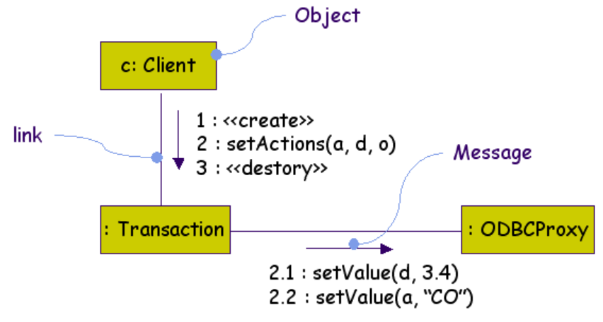 - 객체를 생성하는 생성자 및 소멸시키는 소멸자는 스테레오 타입을 사용하여 create, destroy 메시지로 표현되어 있다.