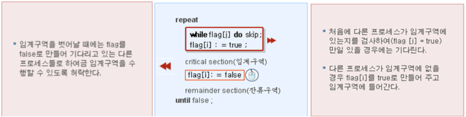 ․ 다음에 임계구역을 수행하고, 이곳에서 벗어날 때 flag를 false로 만들어(기다리고 있는)다른 프로세스로 하여금 임계구역을 수행할 수 있도록 허락한다.