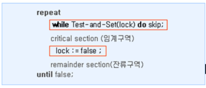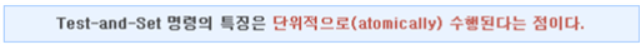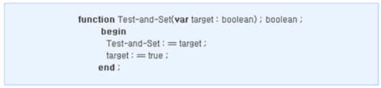 6. Test-and-Set 는 IBM에 의해 제안된 동기화 문제를 해결하기 위한 기법으로 하드웨어적으로 수행되며 공용변수가 변경되는 동안 인터럽트의 발생을 허용하지 않는다.