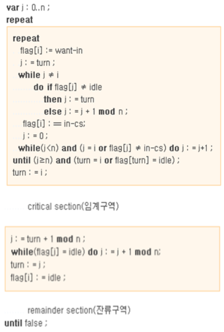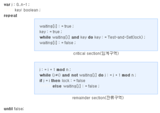 * 순환순서(i, i+1, …, n-1, 0, …, i-1)에서 제일 처음으로 해당되는 프로세스가 임계구역에 들어 간다.