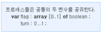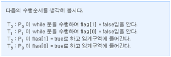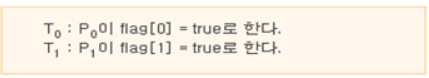 ․ 만약 두 프로세스가 임계구역을 동시에 수행하게 될 경우에는 flag[0] = flag[1] = true가 될 것이다.