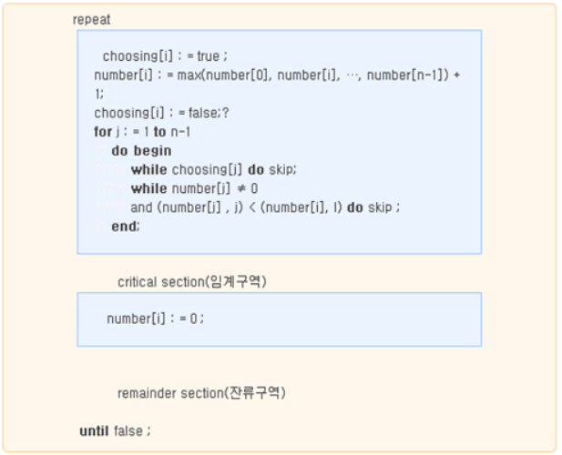 * ③의 성질을 증명하기 위해서 프로세스가 임계구역을 나올 때는 순환순서 내에서 처음의 경쟁자 프로세스를 단일 후계자로 지정하여 임계구역으로의 진입을 기다리는 어떠한 프로세스도 n-1번 이내에 진입하게 한다는 것을 보장함을 보여 준다.