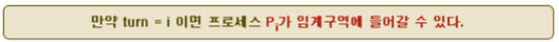 * 어떤 프로세스도 임계구역에 있지 않거나 나오지 않을 때는 turn의 값은 불변이다.