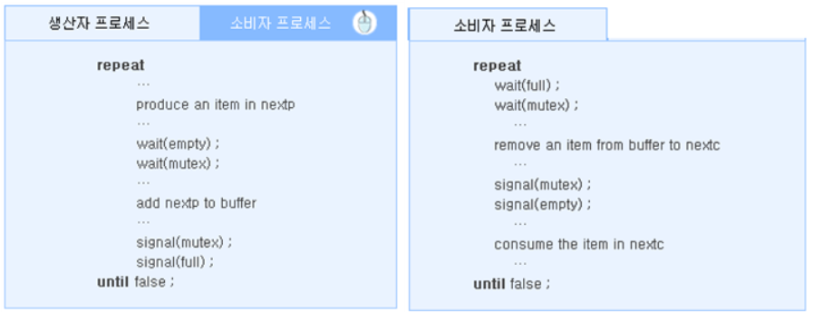 ․ ‘empty'와 ’full' 세마포어 : 각각 비거나 차 있는 버퍼의 수를 표시하며 각각 'n'과 '0'으로 : 초기화되어 있다.