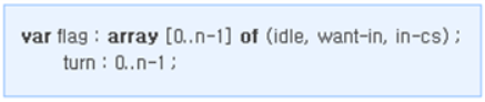 ․ 알고리즘 1에 의한 문제를 해결하기 위하여 변수 turn을 다음 배열로 대치한다.