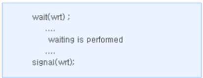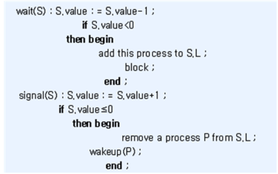 ◎ 프로세스가 wait조작을 수행하고 세마포어 값이 양이 아님을 발견했을 때 그 프로세스는 대기해야 하나 수행상태대기보다는 프로세스 자체를 봉쇄(block)시킬 수 있다.