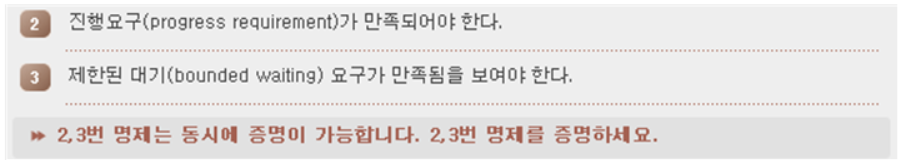 제한대기 | 한 프로세스가 임계구역에 대한 요청 후부터 요청의 수락까지의 기간 내에 다른 프로세스가 임계구역을 수행할 수 있는 횟수에는 제한이 있어야 한다. |