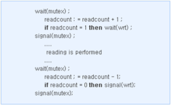 * mutex 세마포어는 변수 readcount가 갱신되는 중에 상호배제를 위해 사용된다.