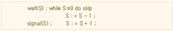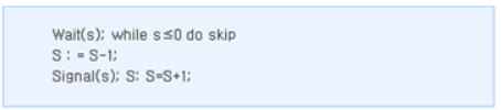 ․ 수행상태대기(busy waiting) 세마포어에서는 그 값이 절대 음수가 될 수 없으나, 여기에 구현된 세마포어의 값은 음수가 될 수 있다.