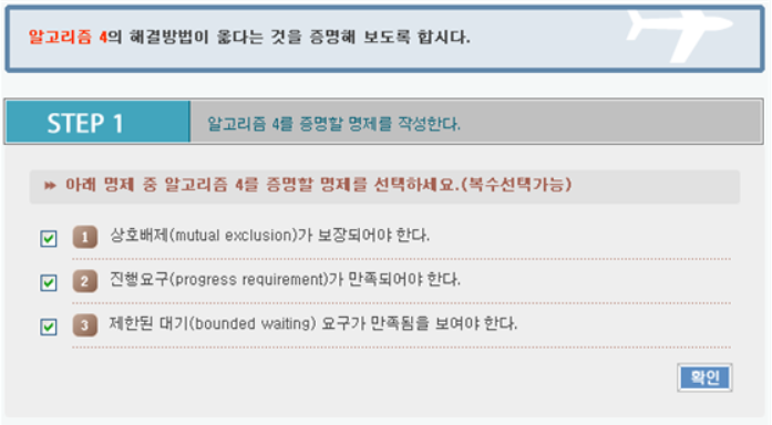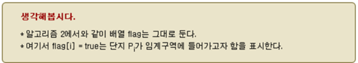 ․ 알고리즘 2에 의한 문제는 프로세스는 Pi에서 프로세스 Pj가 변수 flag[j]의 상태를 변경하기 전에 Pj의 상태에 대한 검사를 하는 데 있다.