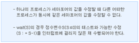 ․ 2개의 프로세스가 동시에 같은 세마포어에 대하여 wait와 signal 조작을 할 수 없게 해야 한다.
