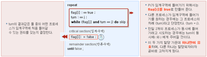 ․ 이것이 유일한 루프(loop)입니다. Pj가 임계구역에 들어갈 필요가 없을 때에는 flag[j] = false가 되며, Pi가 되며 임계구역에 들어갈 수 있게 됩니다.