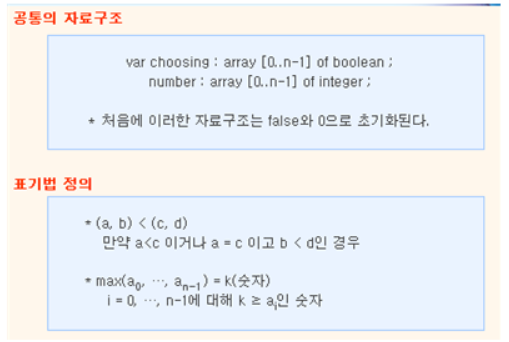 ․ 프로세스는 P0와 P1으로 번호를 붙이고 알고리즘이ㅣ 주어졌을 때 단지 공통변수들만을 정의하고 프로세스는 Pi로 표시한다.