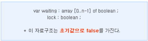 ․ 배열의 요소는 false로 초기화됩니다. 만약 flag[i]가 true이면 프로세스 Pi가 임계구역에서 수행중이다.