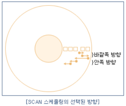 ․선택된 방향이 현재 외부 방향이면 SCAN은 외부 방향에서 가장 짧은 탐색거리를 선택하며, 최외각 실린더를 만나거나 선택된 방향에서 기다리는 요구가 더 이상 없을 때에는 방향을 바꾸어 작업을 계속한다.