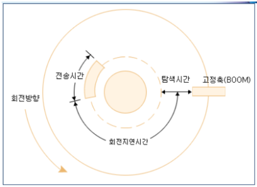 ․데이터가 현재 위치에서 판독/기록 헤드에 인접한 위치까지 회전하는데 걸리는 시간을 회전지연시간(rotational latency time) 또는 대기시간이라고 한다.