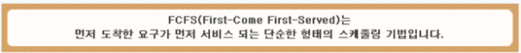| FCFS 스케줄링의 요구 | ․FCFS(First-Come First-Served) 스케줄링에서는 먼저 도착한 요구가 먼저 서비스를 받습니다. ․FCFS는 일단 요구가 도착하면 실행예정순서가 고정된다는 점에서는 공평합니다. |