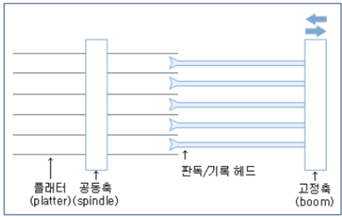 ․모든 판독/기록 헤드는 하나의 고정축(boom)이나 이동 암 조립부 (moving-arm assembly)에 연결되어 있으며, 고정축은 안팎으로 이동할 수 있다.