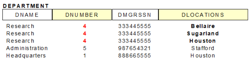 | ∘복합 애트리뷰트(composite attribute), 다치 애트리뷰트(multivalue attribute), 그리고 중첩 릴레이션(nested relation) 등 비원자적(non-atomic) 애트리뷰트들을 허용하지 않은 릴레이션의 형태 - 애트리뷰트의 도메인이 오직 원자값(atomaic value)들만 포함하고, 투플의 모든 애트리뷰트 값은 그 애트리뷰트 도메인에 속하는 하나의 값이어야 함 - '릴레이션 안의 릴레이션‘, ’애트리뷰트 값들로서의 릴레이션‘은 허용치 않음 ∘제1 정규형이 아닌 릴레이션 스키마 및 릴레이션 인스턴스의 예는 다음 그림과 같음 - 즉 릴레이션 DEPARTMENT의 DLOCATIONS 애트리뷰트에는 원자값이 아닌 세 개의 값{Bellaire, Sugarland, Houston}을 볼 수 있음 - 릴레이션의 각 애트리뷰트는 기본키 DNUMBER에 함수적으로 종속되어 있음 ![]() [그림 6] 제1 정규형이 아닌 릴레이션 스키마 및 그 인스턴스의 예 ∘릴레이션 DEPARTMENT에서 비원자적 요소를 단순하게 원자값으로 변형하여 제1 정규형 버전으로 변형할 경우 다음과 같이 기본키 DNUMBER의 중복현상을 초래함 - 이 경우 기본키를 {DNUMBER, DLOCATIONS}로 할 경우 중복데이터가 발생하기 때문에 DLOCATIONS 애트리뷰트를 제거하여 별도의 릴레이션 {DNUMBER, DLOCATIONS} 을 구성하는 것이 바람직함 ![]() [그림 7] 중복이 포함된 제1 정규형 릴레이션 |