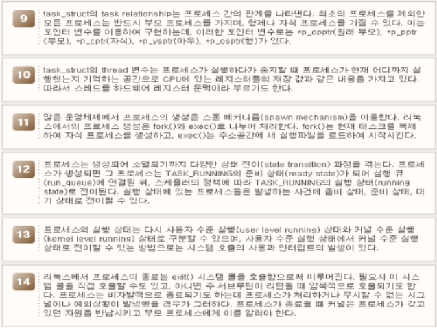 ▶ 커널은 프로세스의 우선 순위, 프로세스가 실행 상태에 있는지 아니면 어떤 사건을 기다리며 블록 상태에 있는지, 프로세스에 어떤 주소 공간이 할당되어 있는지, 어떤 파일을 다룰 수 있는지 등을 알아야 한다.
