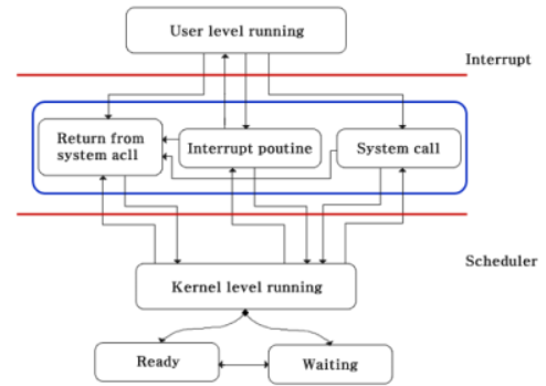 | 인터럽트의 발생 | *시스템 호출과 마찬가지로 인터럽트가 발생되면 리눅스 커널에 인터럽트가 걸리게 된다. *이때 실행 중이던 프로세스가 사용자 수준에서 동작하고 있었다면 커널 수준 실행 상태로 전이되고, 커널의 인터럽트 처리 루틴으로 제어가 넘어가게 된다. |