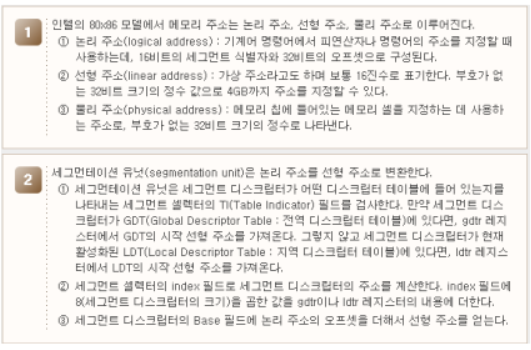 ․프로그래머들은 메모리 주소(memory address)를 단순히 메모리 셀(cell) 내용에 접근하는 방법으로 생각합니다. 그러나 80x86 마이크로 프로세서를 다루려면 세 종류의 주소인 논리 주소, 선형 주소, 물리 주소를 구별할 수 있어야 합니다 .
