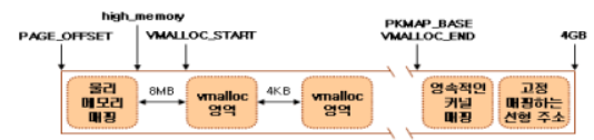 ․선형 주소의 빈 범위를 찾기 위해 PAGE_OFFSET(보통은 마지막 1GB의 시작 주소인 0xc0000000)부터 시작하는 영역을 들여다 볼 수 있다.