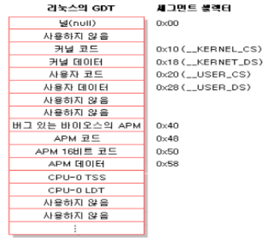 ․리눅스에서 사용하는 세그먼트로는 커널 코드 세그먼트, 커널 데이터 세그먼트, 사용자 코드 세그먼트, 사용자 데이터 세그먼트, 작업 상태 세그먼트(TSS), 기본 지역 디스크립터 테이블(default LDT), 고급 전원 관리(APM : Advanced Power Management) 지원과 관련한 4개의 세그먼트가 있다.