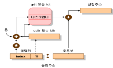 ․세그먼트 셀렉터의 index 필드로 세그먼트 디스크립터의 주소를 계산한다. index 필드에 8(세그먼트 디스크립터의 크기)을 곱한 값을 gdtr이나 ldtr 레지스터의 내용에 더한다.